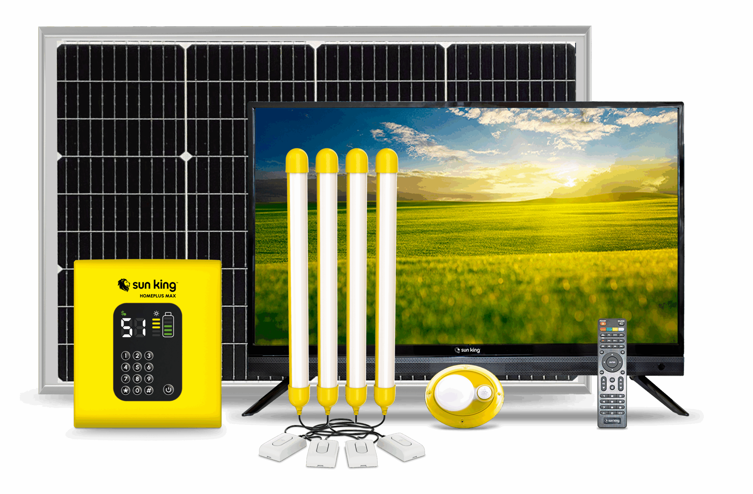 The HomePlus Max is Sun King’s most powerful solar home system. It provides lighting as bright as a modern, grid-powered home, and can power a range of devices and appliances simultaneously, including the Sun King 24″ HD TV meaning you won’t miss a moment of your favourite shows during blackouts.